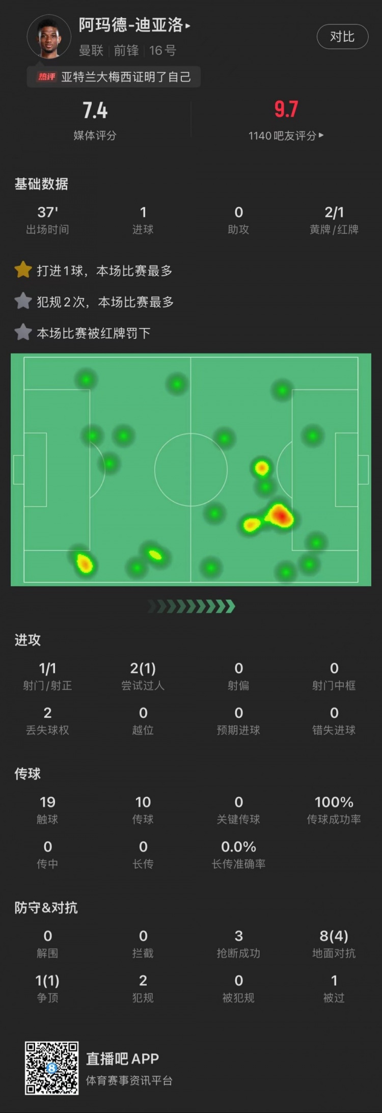 阿玛德全场数据:1粒绝杀球,1张红牌,传球成功率100%