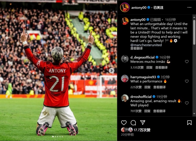 安东尼庆祝晋级:很骄傲能帮上忙,我会继续努力、永远不停止战斗