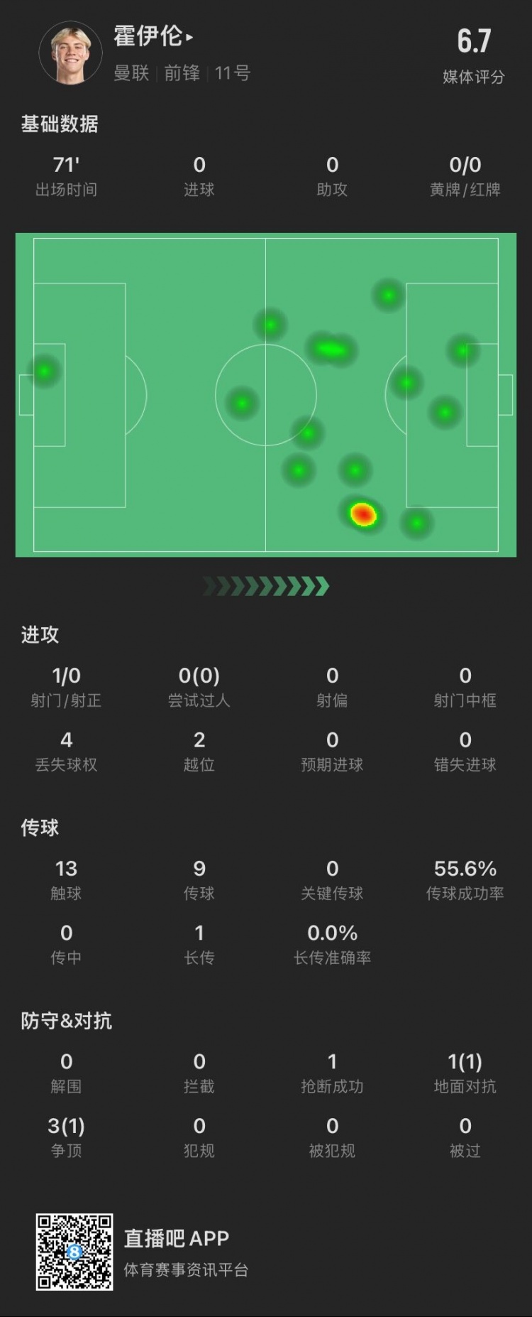 孤立无援????霍伊伦本场:仅触球13次,1次射门0射正,贡献1抢断
