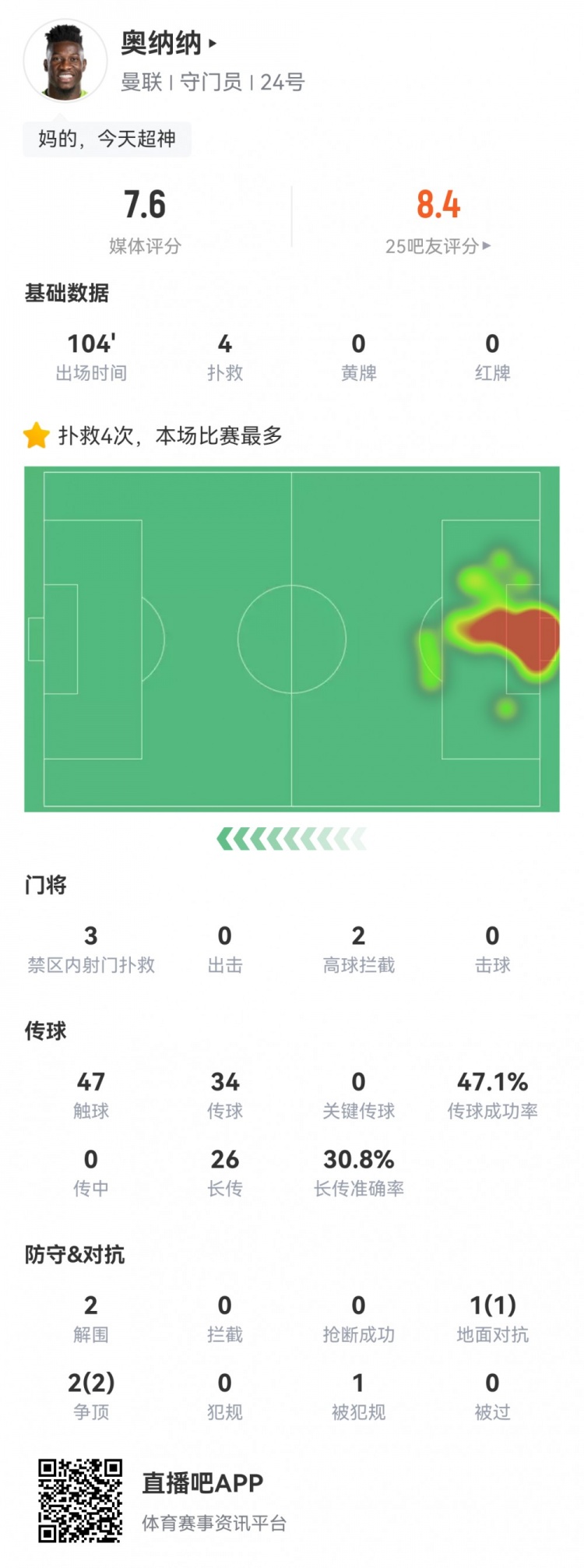 奥纳纳数据:被射31脚丢1球 4次扑救 2次摘高空球 评分7.6