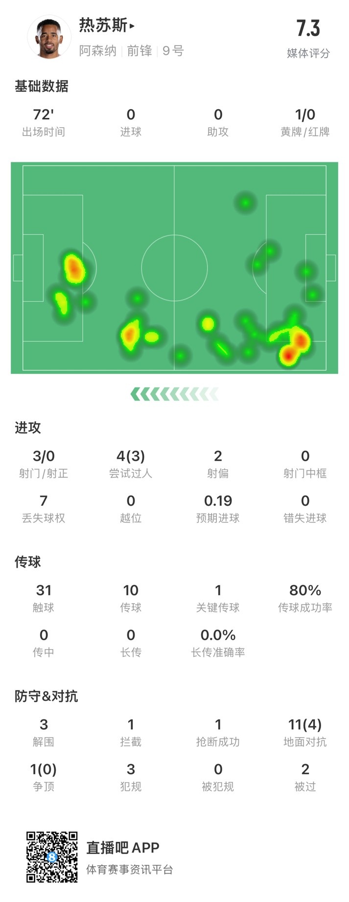 热苏斯本场数据:3射0正,3次成功过人,获评7.3分队内最高