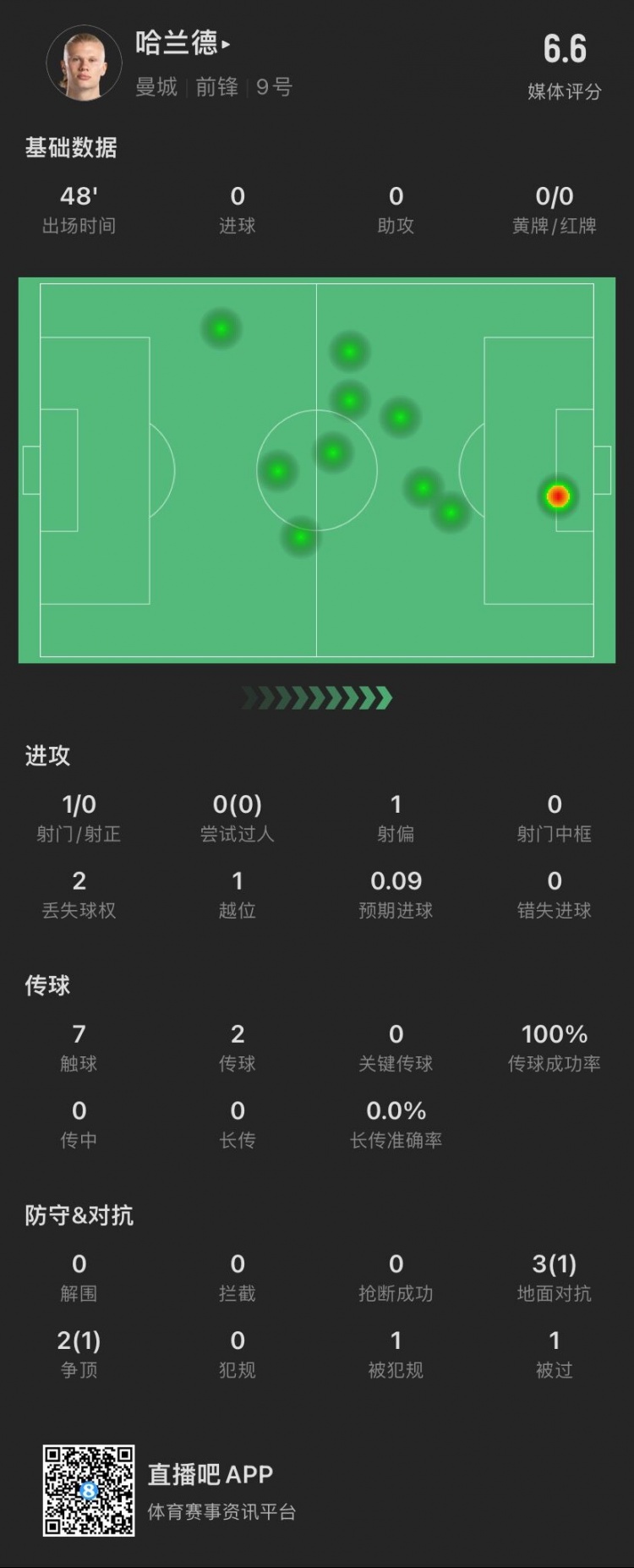 疑似上场!哈兰德半场:触球7次,1次射门未射正,6.6分队内最低