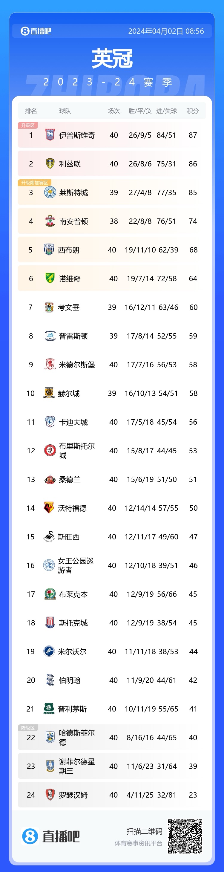 5月11日消息 本赛季英冠,伊普斯维奇积96分排名英冠第二,直接升入下赛季英超,时隔22年重返英超。而在上个赛季,伊普斯维奇以英甲第二的成绩刚刚升入了英冠。据2024-05-11 10:22:44