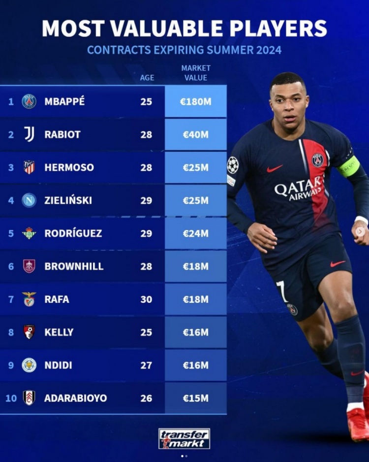 4月3日消息 德国转会市场盘点了合同今夏到期的球员身价排名,姆巴佩1.8亿欧元居首。