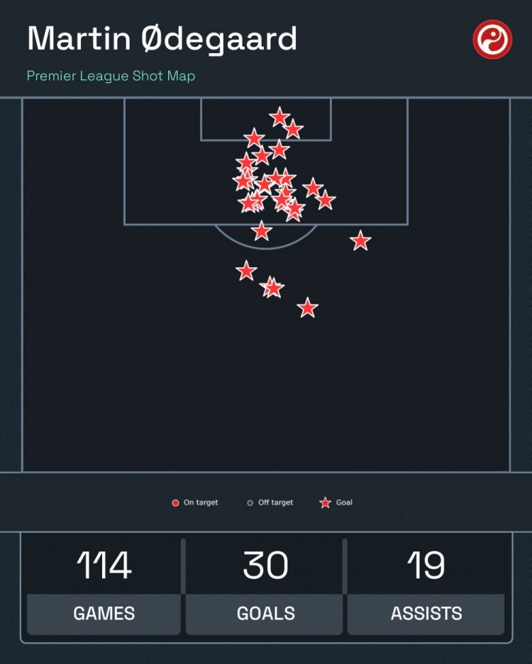 114场30球19助!厄德高已为阿森纳攻入30粒英超进球