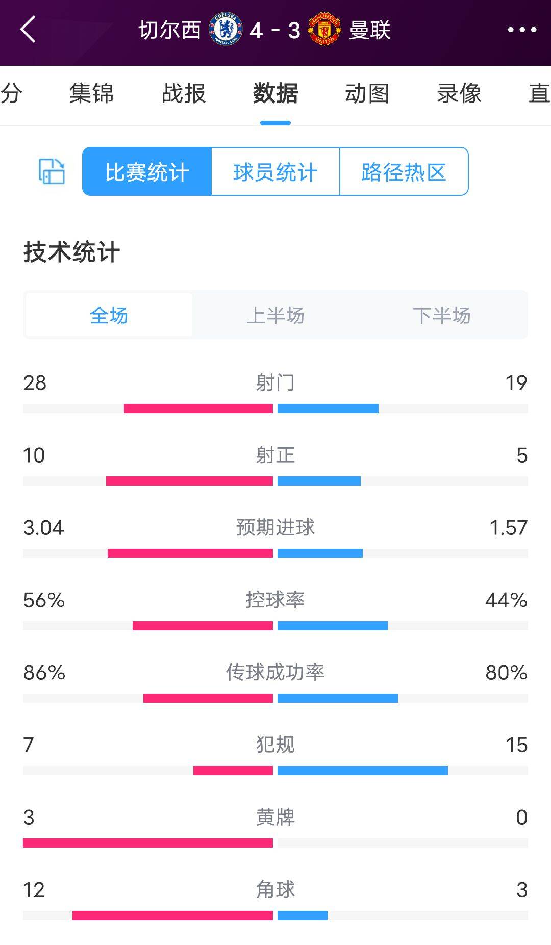 ????滕哈赫称主宰比赛?曼联遭切尔西狂轰28脚!控球率等均落下风