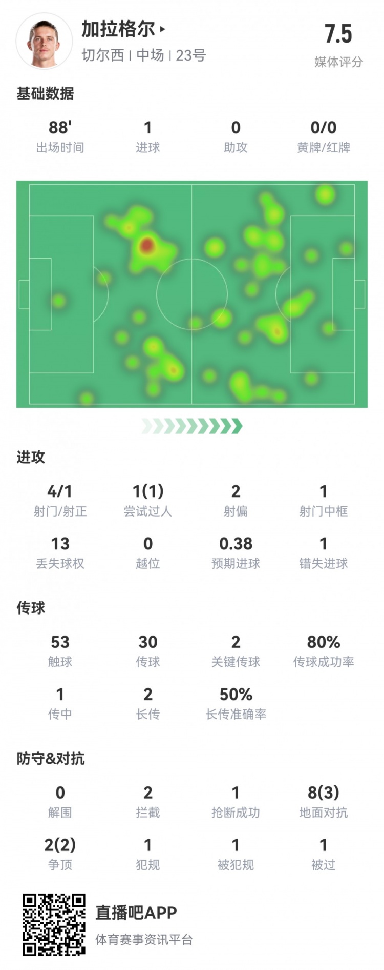 加拉格尔数据:1粒进球,1次创造&错失得分良机,一次中框