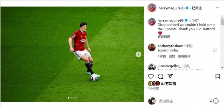 马奎尔社媒谈战平红军:很失望未能保住3分,感谢主场球迷支持