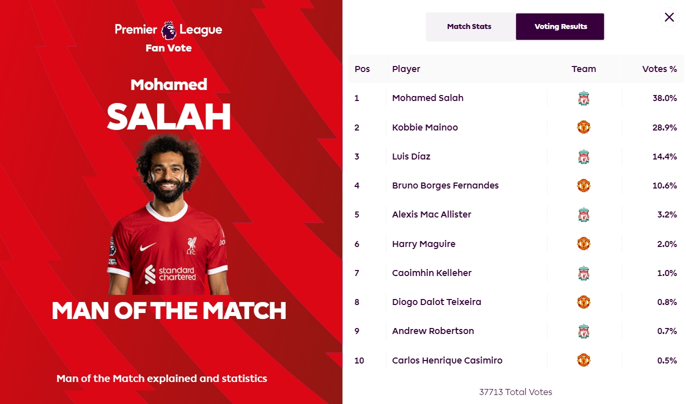 点射破门!官方:萨拉赫当选双红会全场最佳,力压梅努、迪亚斯等
