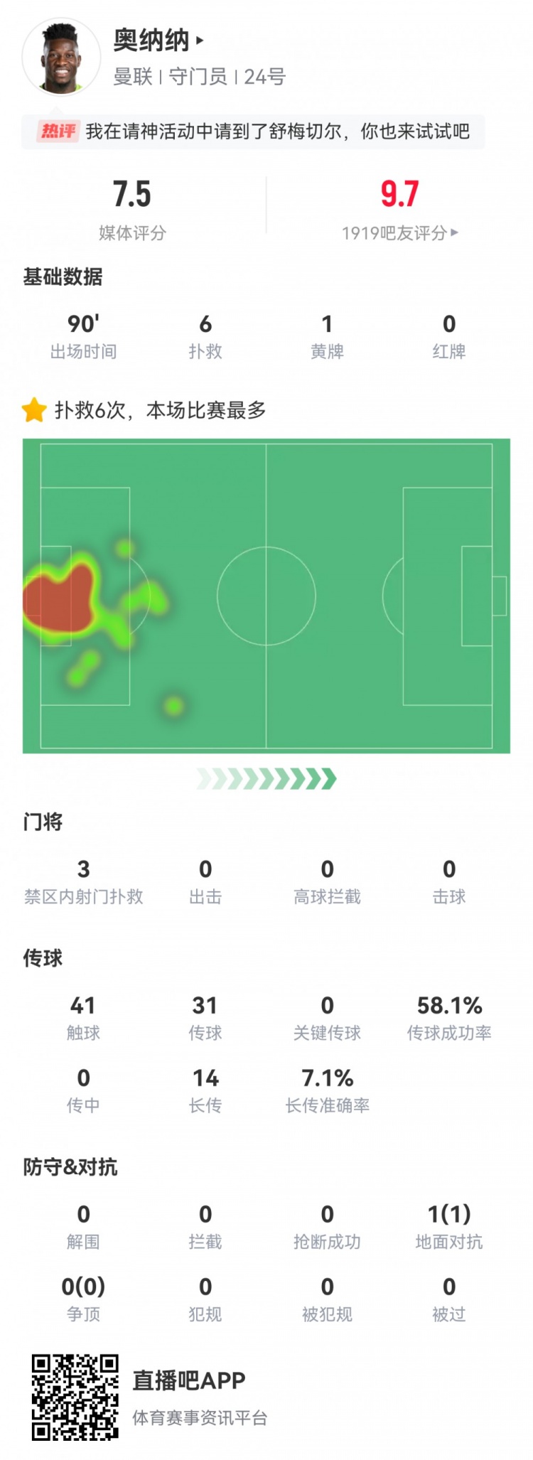 奥纳纳本场数据:6次扑救,1次成功过人,评分7.5