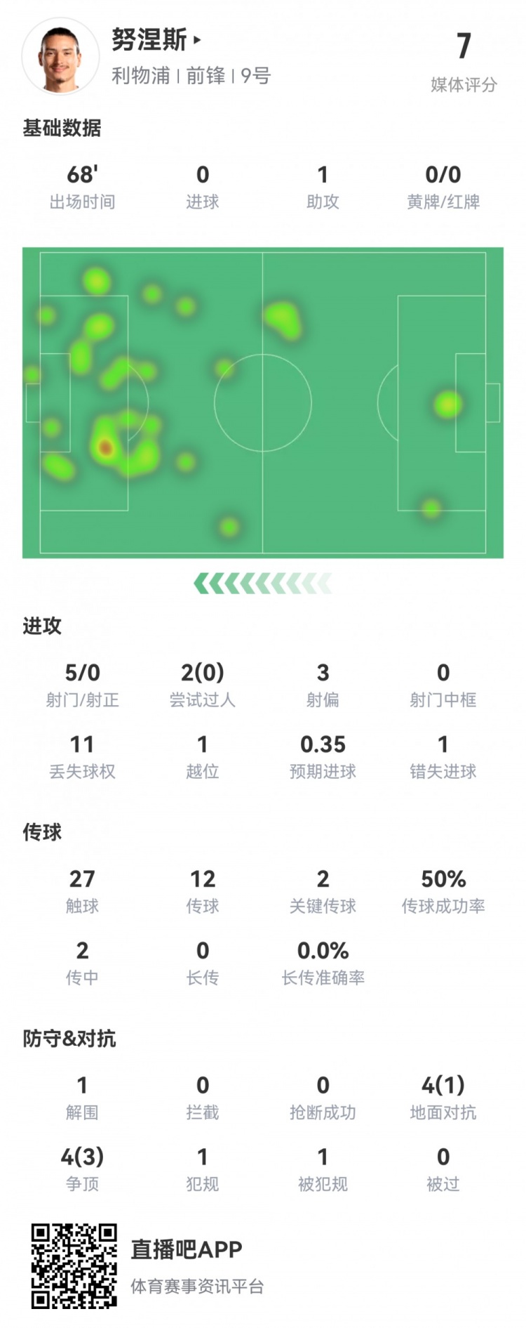 努涅斯本场数据:5射0正,1次助攻,1次创造&错失良机,评分7.0