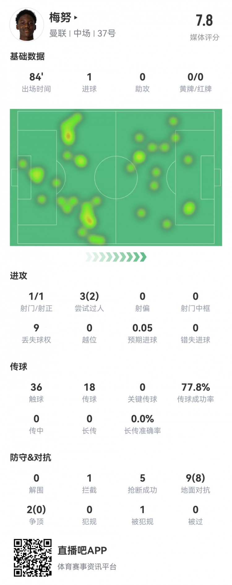 18岁梅努本场数据:1射1正1粒进球,8次成功对抗,评分7.8