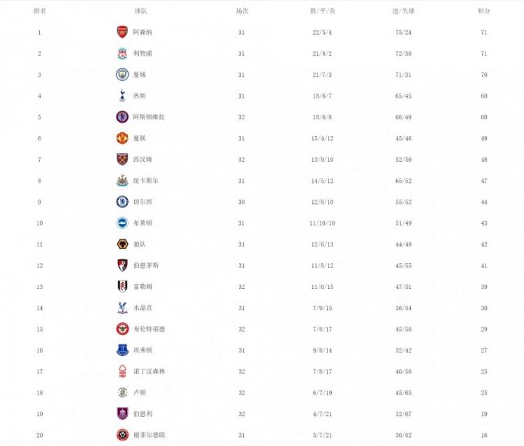 目前英超榜首三强的进球数/失球数依次为:阿森纳-75/24、利物浦-72/30、曼城-71/31(阿森纳领先利物浦9个净胜球、领先曼城11个净胜球)。