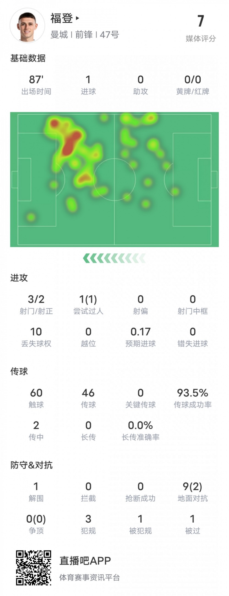 福登本场比赛数据:1进球1过人成功传球成功率93.5%,评分7.0