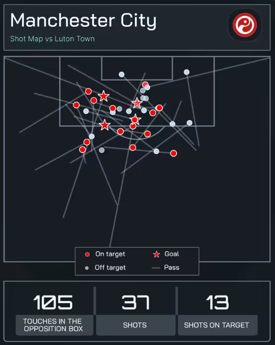 对阵卢顿比赛曼城105次对方禁区内触球,16-17赛季以来英超最多