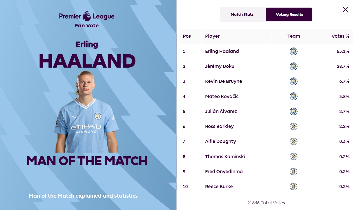 点射&造乌龙,哈兰德当选5-1大胜卢顿一役全场最佳球员