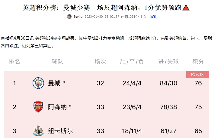 这集我是不是看过?曼城第32场比赛逆袭回榜首,上赛季也是第32场