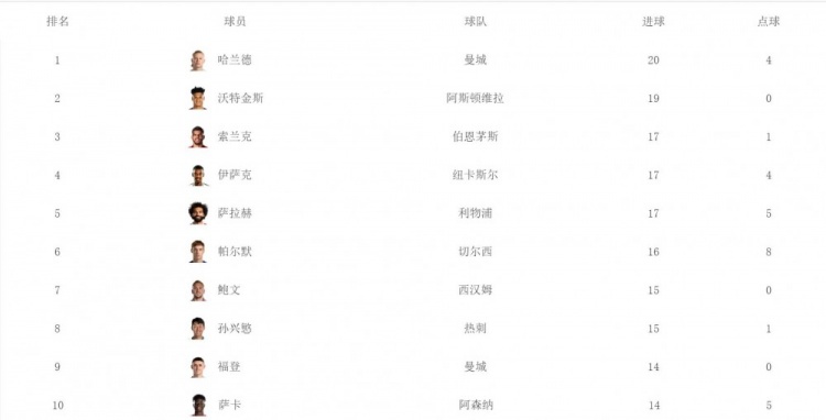 附:本赛季英超截至目前的射手榜: