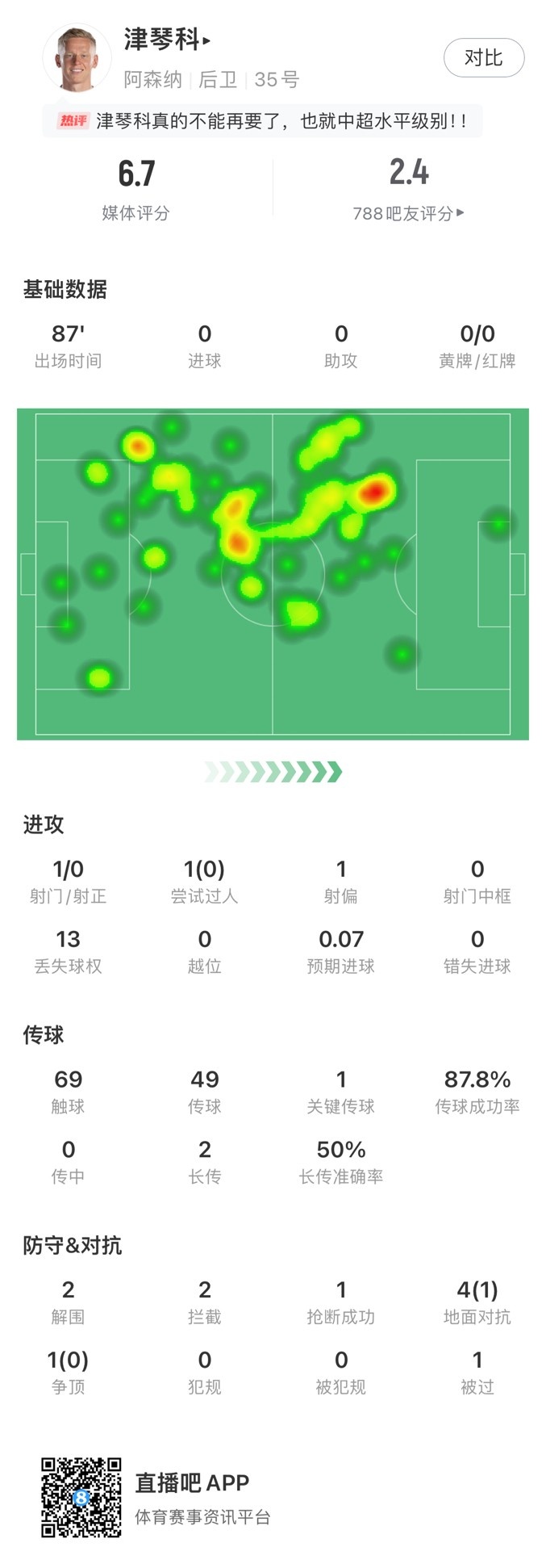 津琴科本场数据:13次丢失球权,4次对抗成功1次,获评6.7分