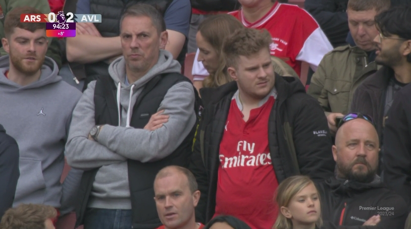郁闷!枪手2球落后维拉,看台阿森纳球迷表情难受