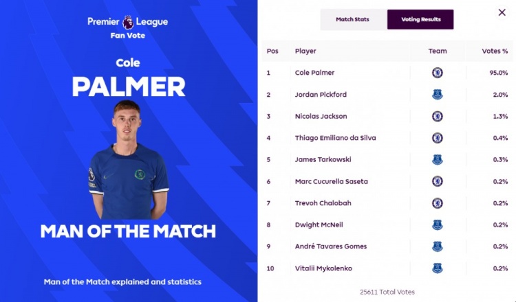 得票率95%!上演大四喜的帕尔默绝对优势当选全场最佳球员