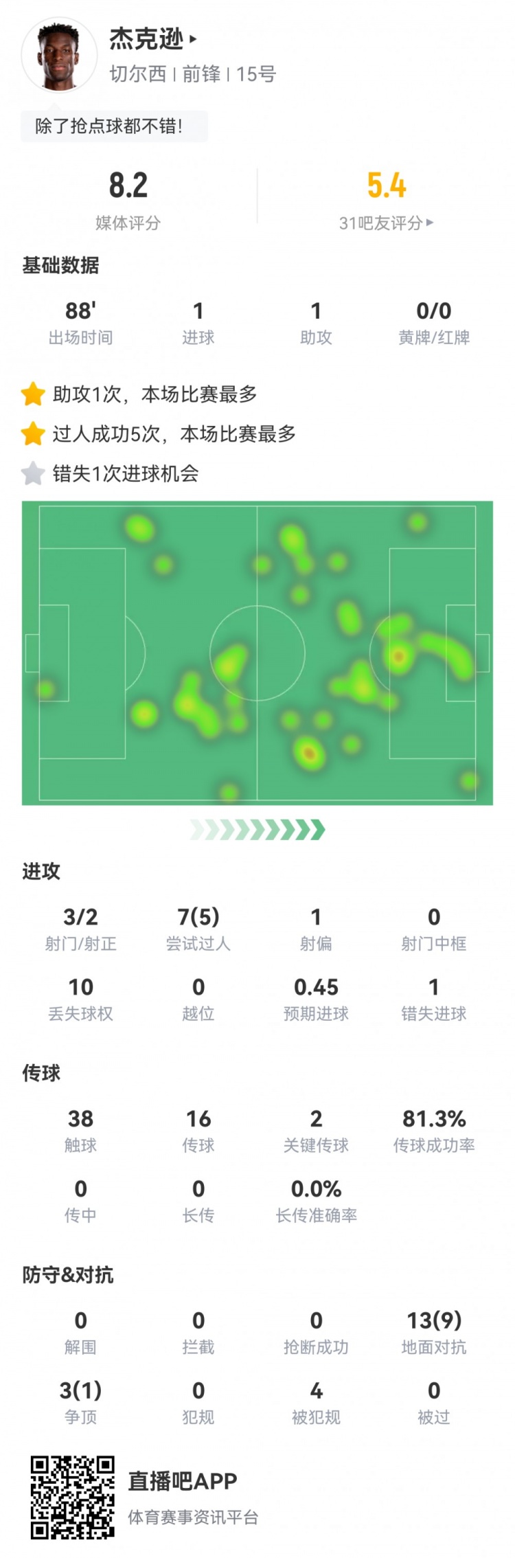 杰克逊本场数据:传射建功,2次关键传球,5次成功过人,评分8.2