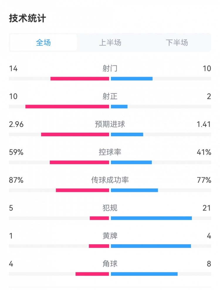 切尔西6-0埃弗顿数据:射正10-2,预期进球2.96-1.41,犯规5-21