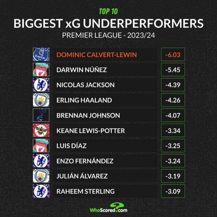 预期进球表现最差的英超球员榜:勒温努涅斯杰克逊哈兰德前四