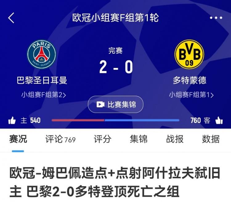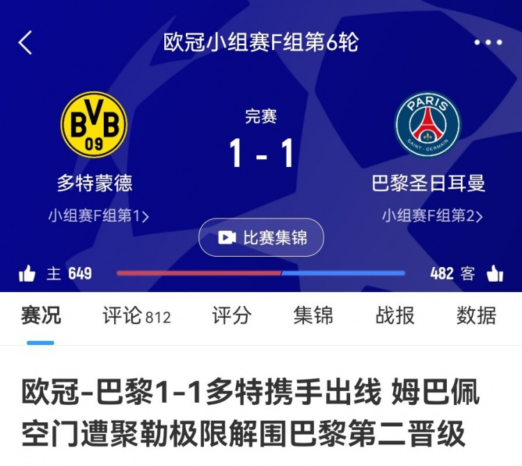 死亡之组的含金量!巴黎vs多特小组赛2-0、1-1携手出线双双四强
