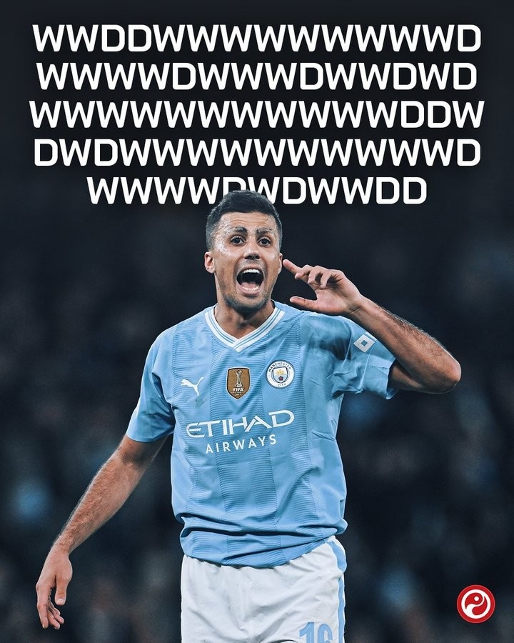 罗德里为曼城出战连续67场不败,战绩51胜16平