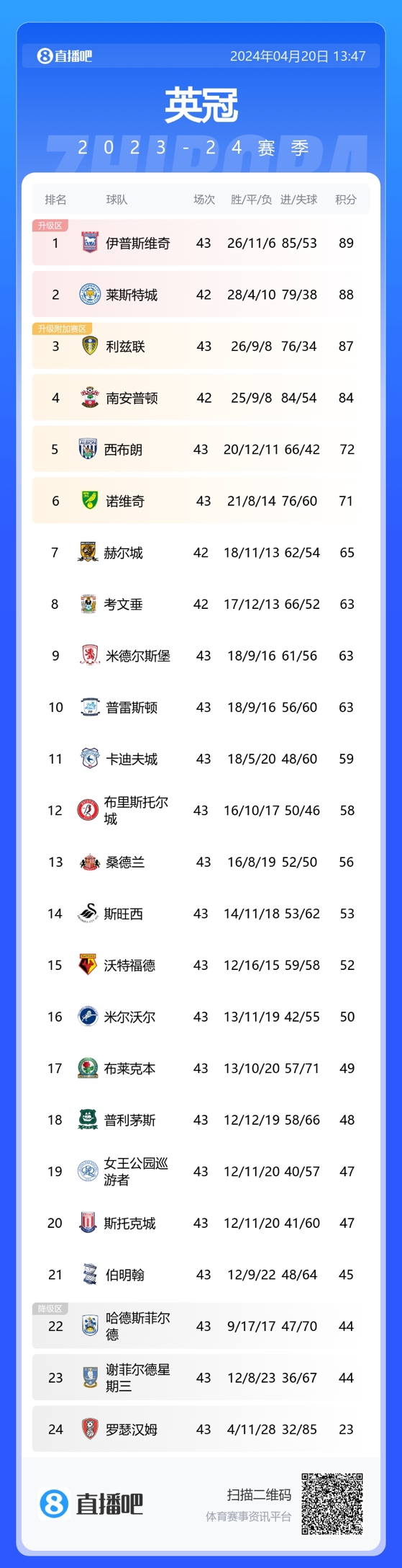 5月11日消息 本赛季英冠,伊普斯维奇积96分排名英冠第二,直接升入下赛季英超,时隔22年重返英超。而在上个赛季,伊普斯维奇以英甲第二的成绩刚刚升入了英冠。据2024-05-11 10:22:44