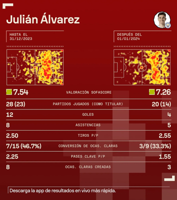 陷低迷????阿尔瓦雷斯上半赛季28场12球,下半赛季目前20场4球