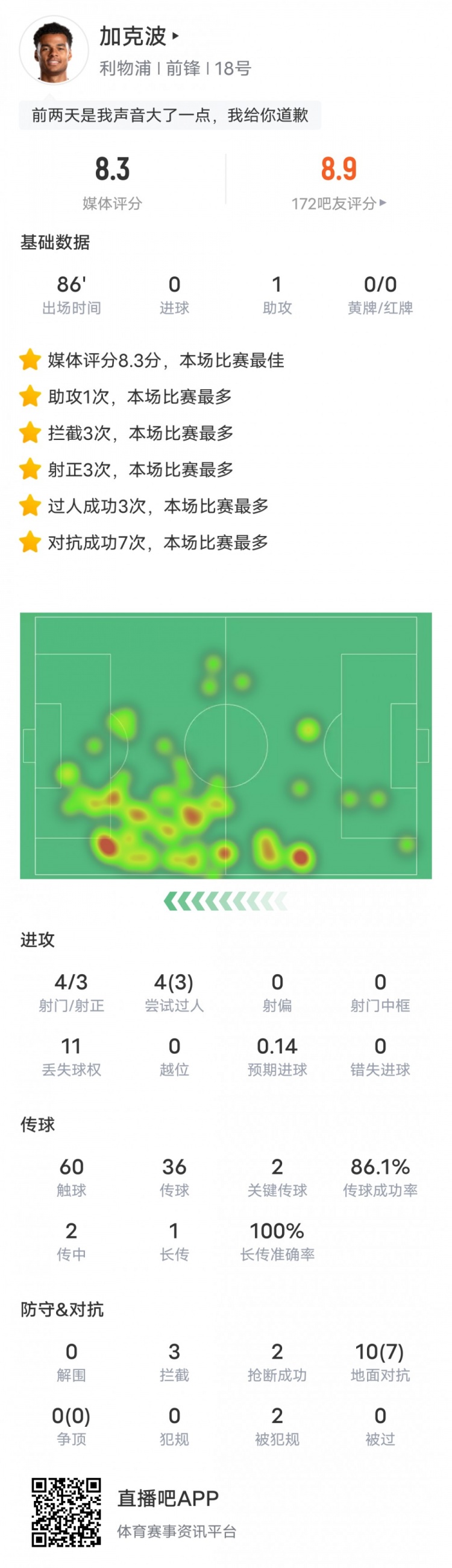 加克波本场数据:1助攻2关键传球3拦截2抢断,评分8.3全场最高