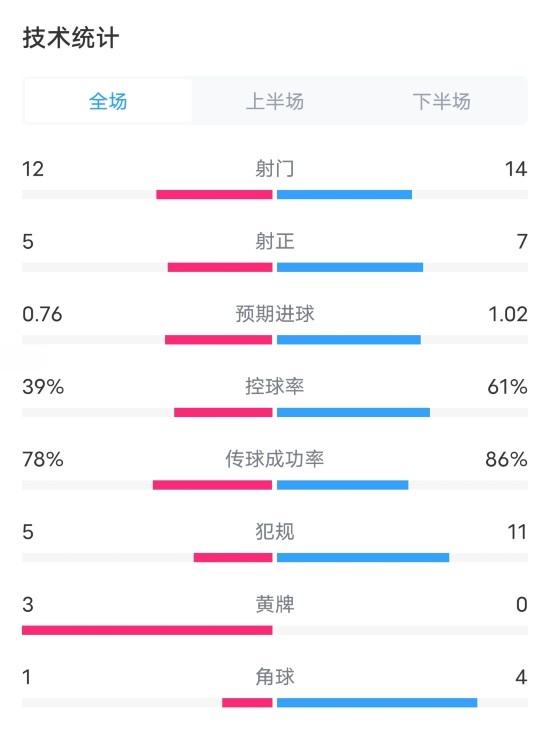 富勒姆VS利物浦全场数据:射门12-14,射正5-7,控球率39%-61%