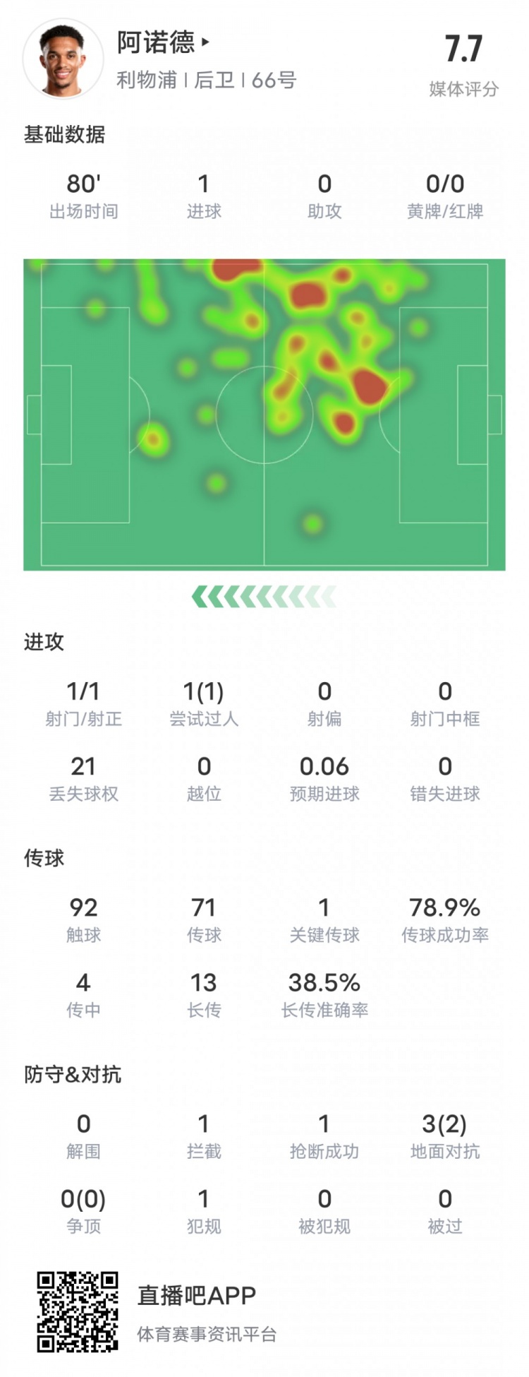 阿诺德本场比赛数据:1进球1关键传球&21次丢失球权,评分7.7