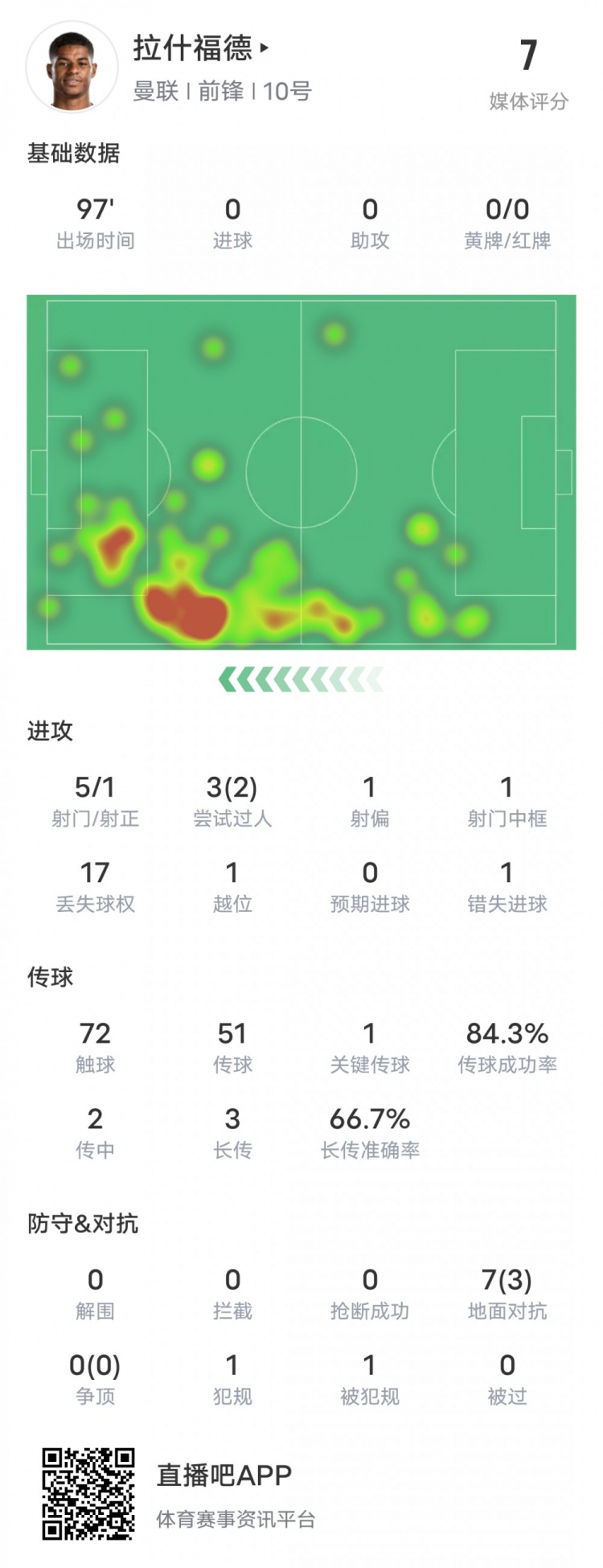 拉什福德本场比赛数据:2过人成功&1错失进球机会,评分7.0