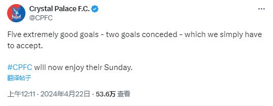 5-2大胜!水晶宫官推模仿森林战报:5个进球2个丢球我们必须接受