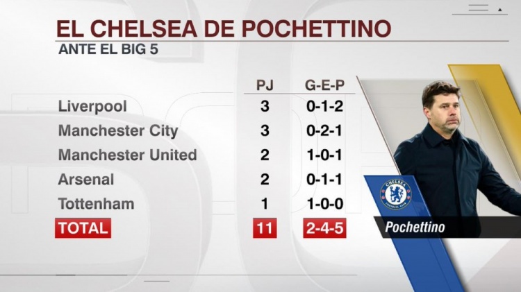 波切蒂诺上任以来,切尔西对阵BIG6战绩2胜4平5负
