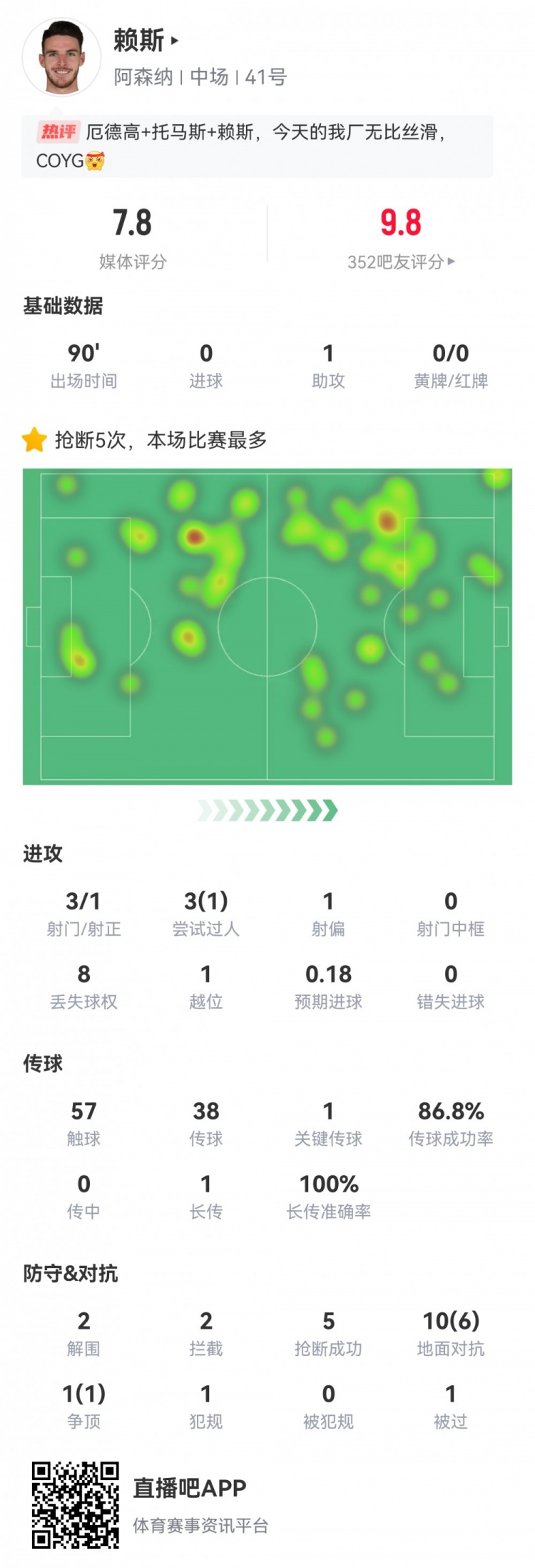赖斯本场数据:3射1正,1次助攻,1次关键传球,5次抢断,评分7.8