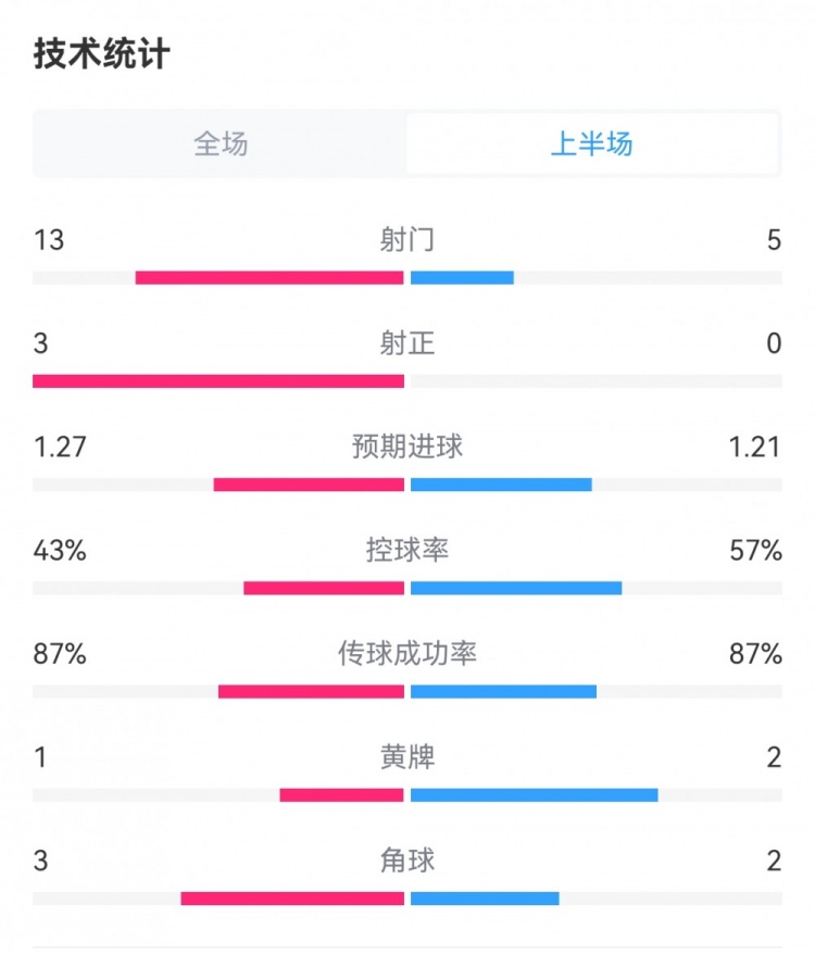 枪手1-0蓝军半场数据:射门13-5,射正3-0,预期进球1.27-1.21
