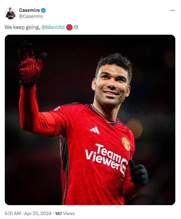 卡塞米罗晒照庆祝胜利:我们继续前进,曼联???? !!!