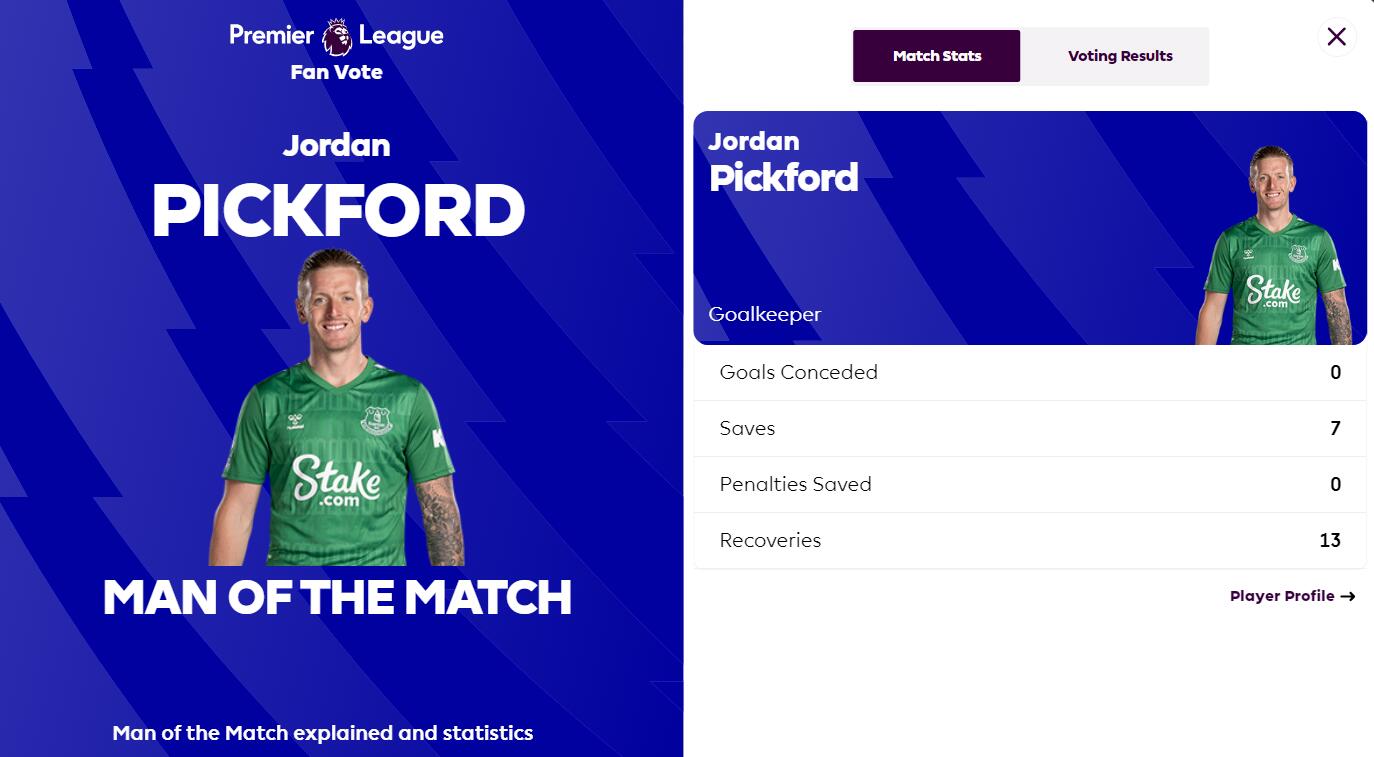 7次扑救零封利物浦,皮克福德当选默西塞德德比全场最佳