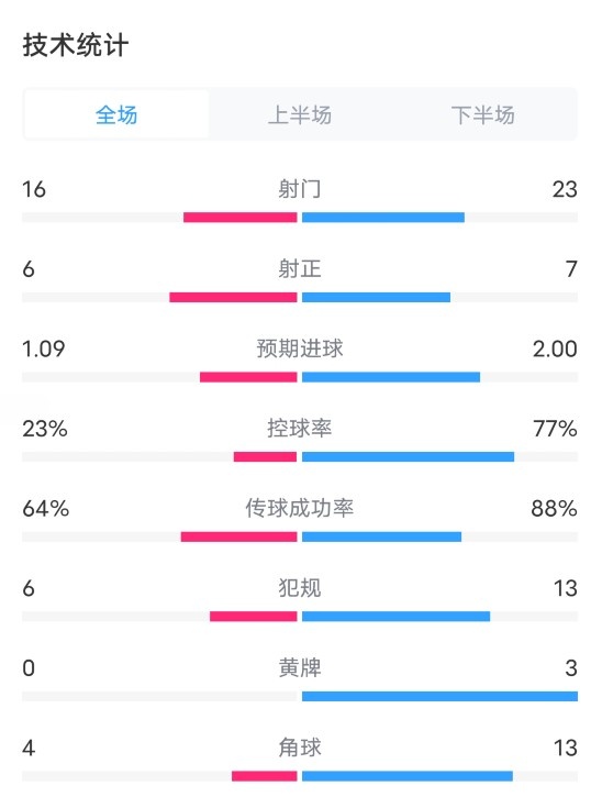 埃弗顿VS利物浦全场数据:射门16-23,射正6-7,控球率23%-77%