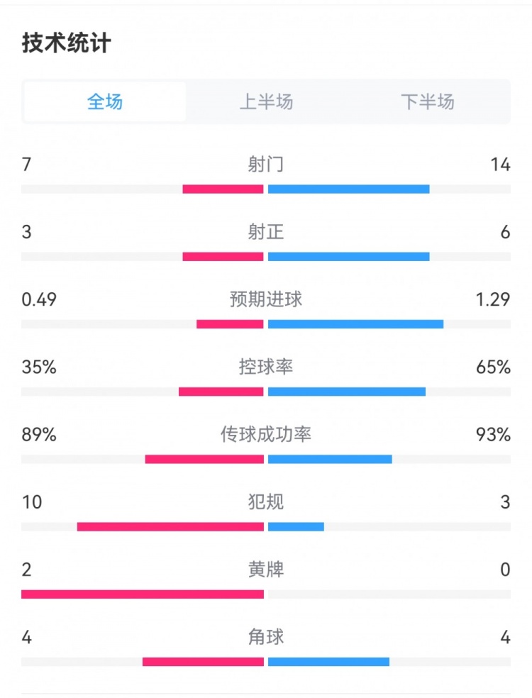 曼城4-0布莱顿数据:射门14-7,射正6-3,预期进球1.29-0.49