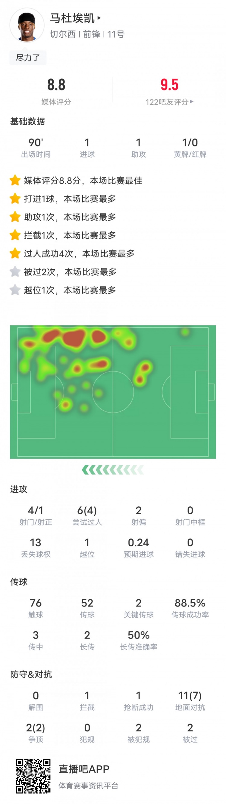 马杜埃凯本场比赛数据:传射建功+4过人成功,评分8.8全场最高