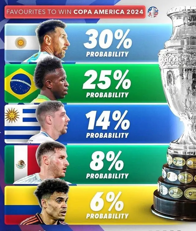 再夺一冠?2024美洲杯夺冠概率:阿根廷30%最大热门 巴西25%第二