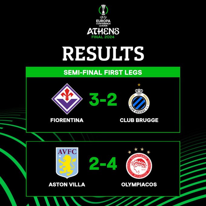 5月3日消息 欧协联半决赛首回合结束,佛罗伦萨主场3-2击败10人布鲁日,维拉主场2-4不敌希腊球队奥林匹亚科斯。