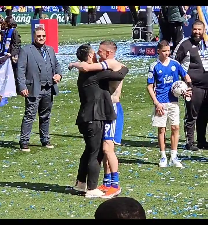 泪目????梦回蓝狐奇迹!冈崎慎司现场看捧杯,与瓦尔迪深情拥抱