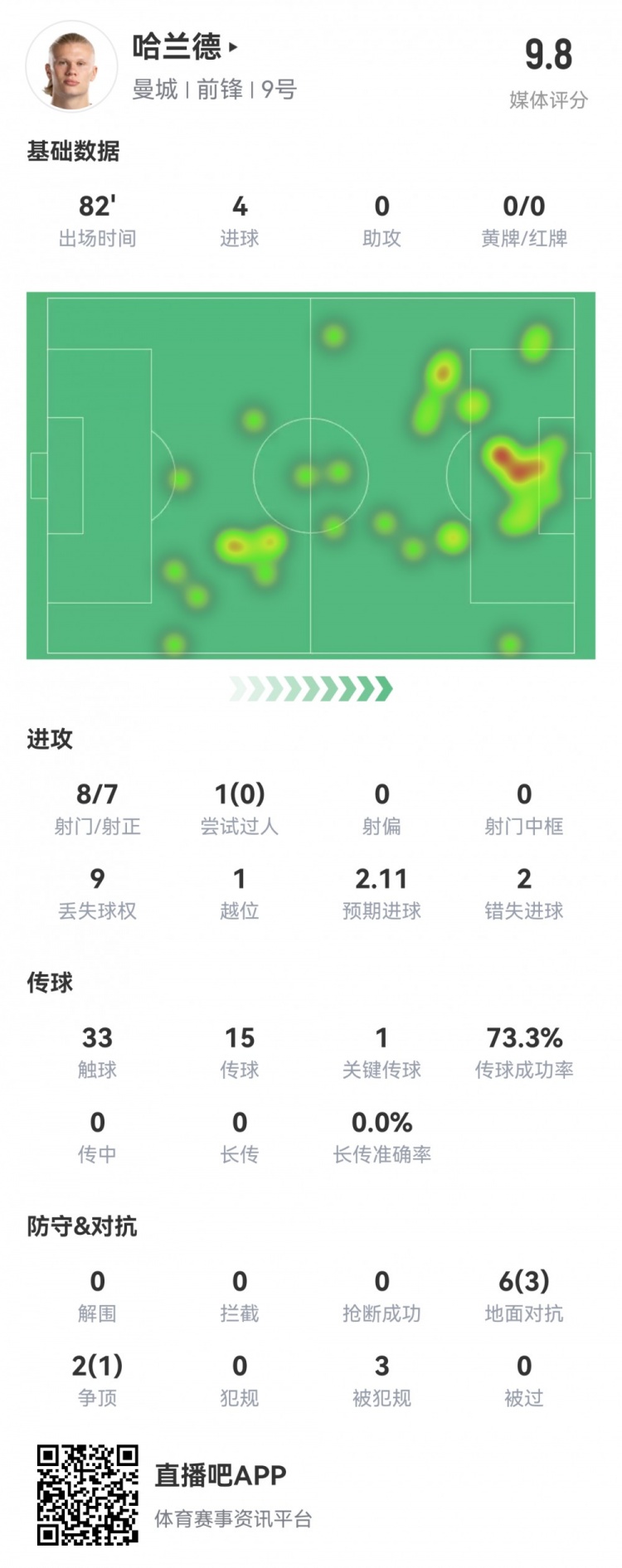 刷爽了!哈兰德数据:8射7正,4粒进球,2次错失良机,评分9.8