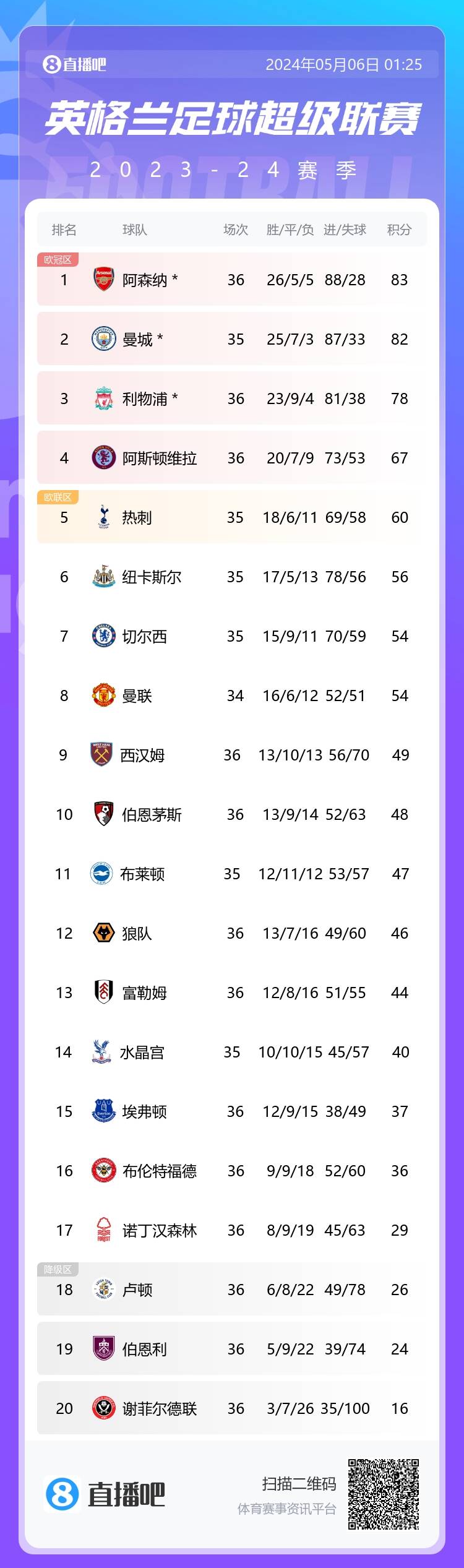 英超积分榜:利物浦止2轮不胜距榜首5分 热刺4连败少赛距前四7分